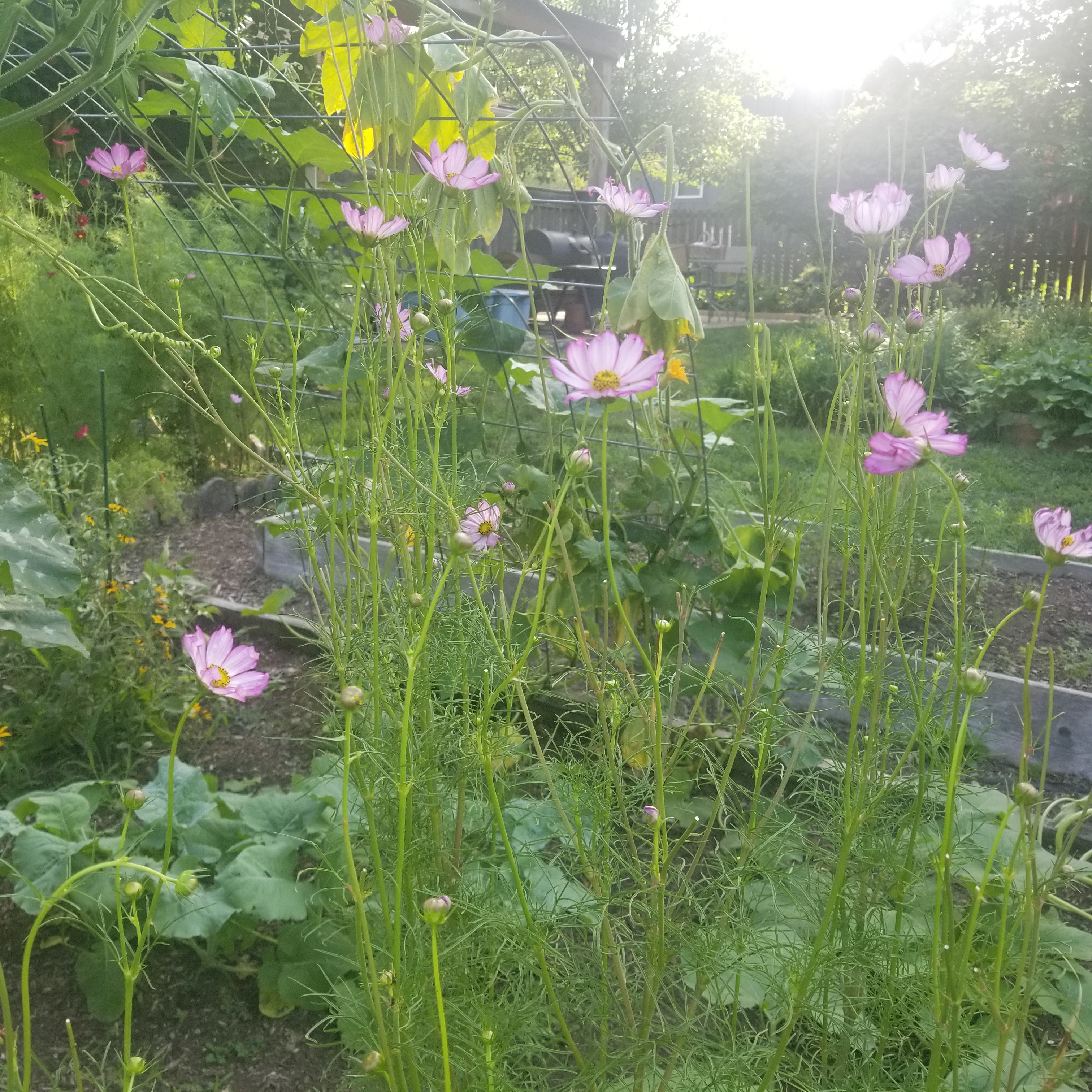 May and June are months of bountiful, beautiful blooms while July and upcoming August are the months of bountiful, beautiful produce. It's been nice to begin gathering cucumbers, tomatoes, squash and potatoes. The kale, swiss chard, and chinese cabbage are continuing to produce so we are still enjoying salads. We have been diligent to water and trim so the garden is still quite lush despite the high temperatures, but not an overgrown jungle. One goal is to try to keep even the vegetable area looking pretty. One way to do this is to interplant flowers ~ cosmos, calendula, zinnias, black-eyed susan, morning glorry ~ with vegetables and it really does make a difference. The continued oppressive heat can be a discouragement, but it we received much rain last evening so we head into August with a well-watered garden.